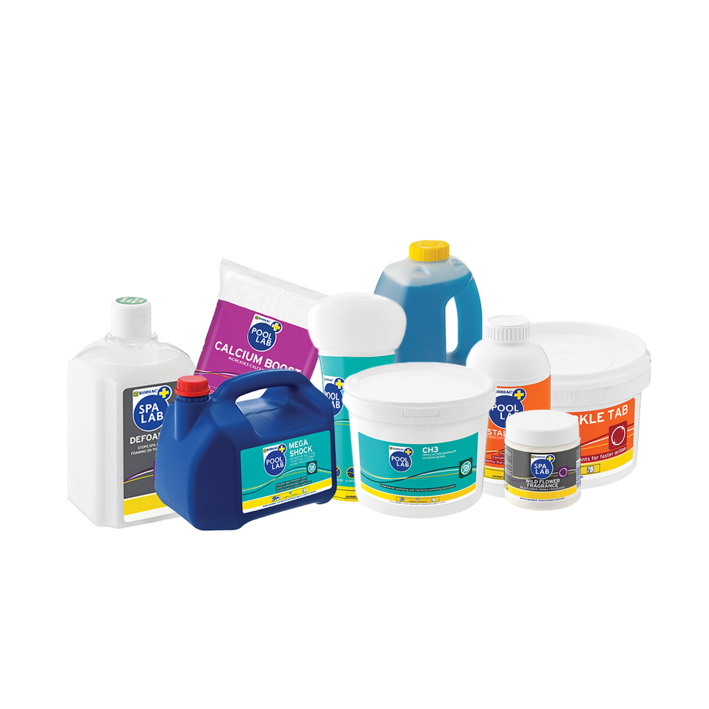 Pool and spa chemicals, cleaners, and spares.